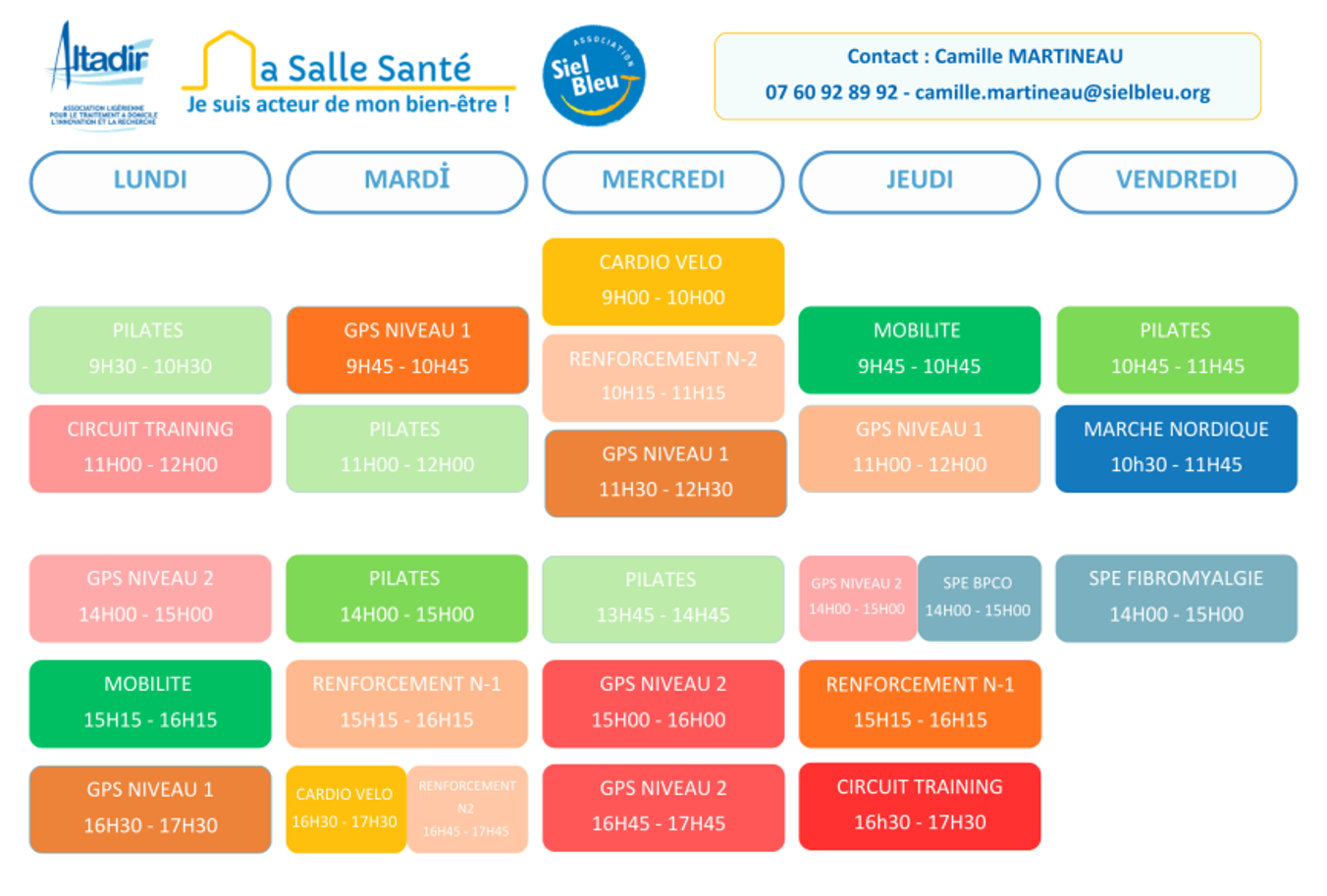 En 2019, L’association ALTADIR et l’association SIEL BLEU ont mis en commun leurs valeurs et leurs compétences pour élaborer le projet de Ma Salle Santé afin de proposer un lieu d’accompagnement aux personnes fragiles dans la prise en charge de l’activité physique, la diététique, l’éducation thérapeutique.
